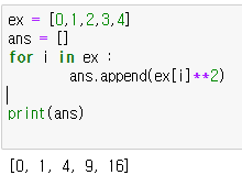 저렇게 append 대신에 [ i ** 2 for i in ex] 로 한번에 표현했다.