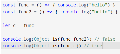 사진에서 알 수 있듯, 생긴건 같아도 두 함수의 참조는 다릅니다. 따라서 Object.is로 비교시 false입니다.