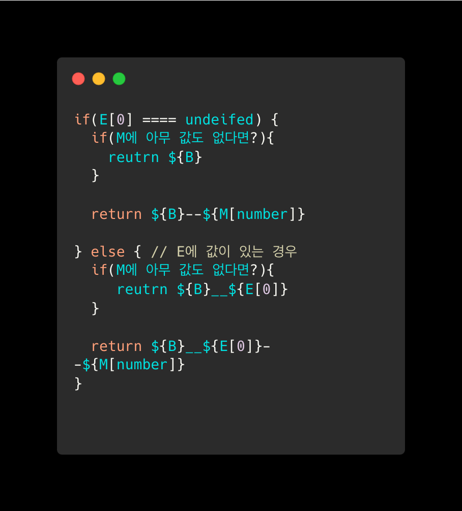 - 템플릿 리터럴 활용, E가 있으면 __, 없으면 --, M은 순회하면서 —