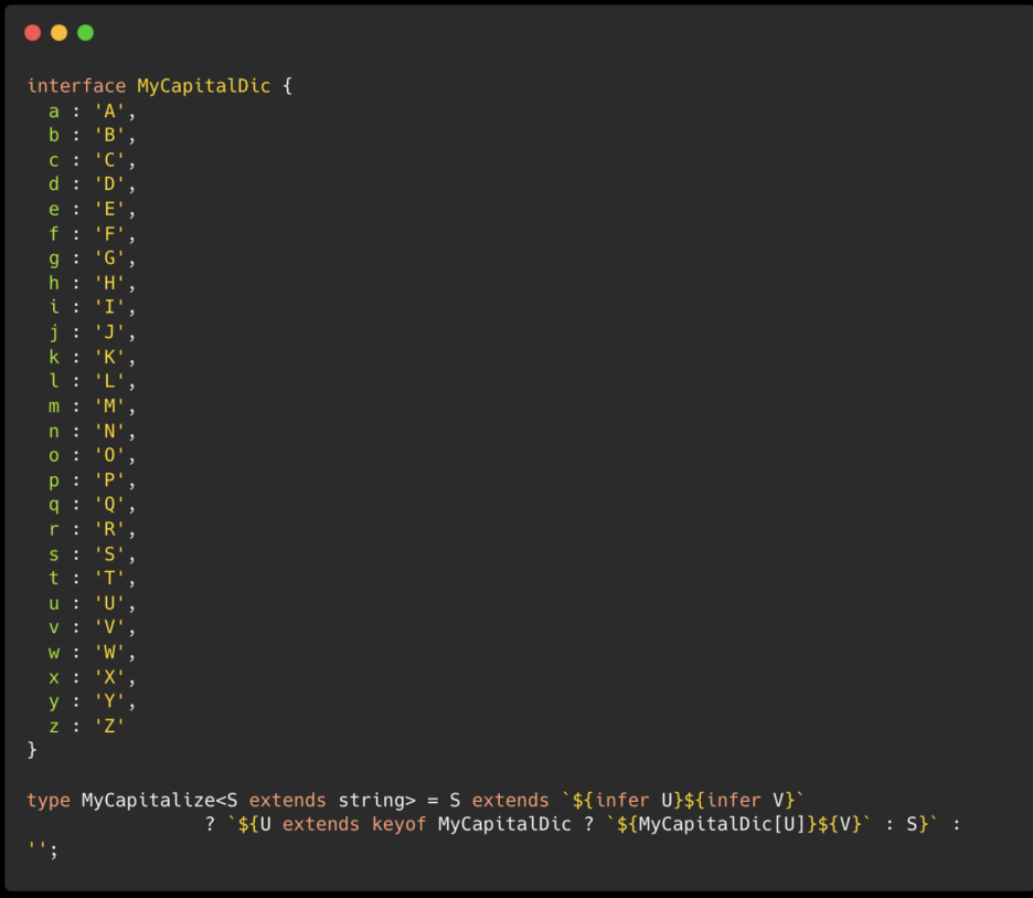 - string에서 ${infer SFirst}${infer SRest} 를 하면 tuple의 [SFirst, ...SRest] 처럼 작동한다.