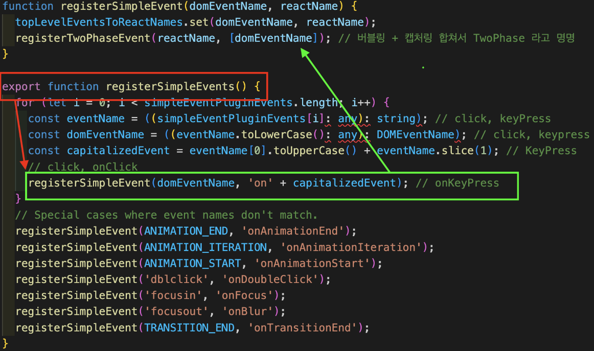 - registerTwoPhase 의 뜻은 이벤트 버블링, 캡처링 케이스를 모두 고려하겠다는 의미입니다.