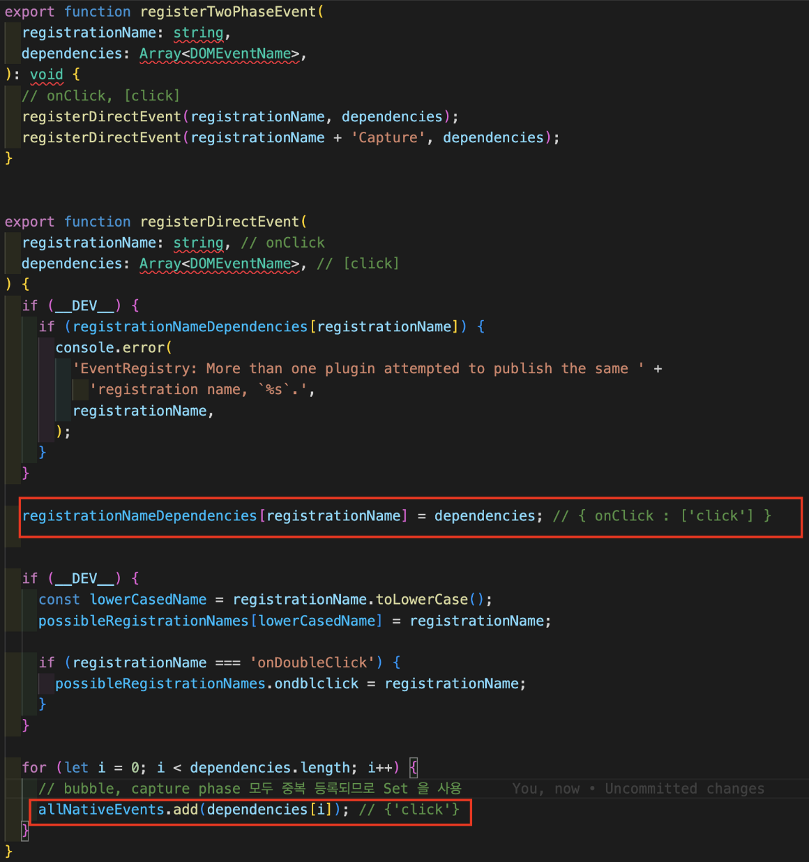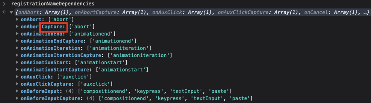 - registrationNameDependencies : 리액트에서 실제로 사용하는 이벤트 이름 onClick, onClickCapture 들이 어떤 이벤트와 매핑되어 있는지 알 수 있는 object