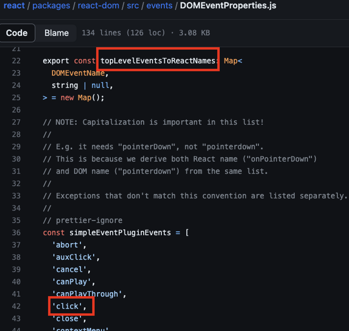 - 여기서 topLevelEventsToReactName, 몇몇 이벤트 리스트들이 보입니다. 리액트에서는 'click' 대신 'onClick' 을 사용하는데, 변환해주는 Map을 바로 이 시점에 생성하게 됩니다. (나중에 코드에서 사용처를 확인할 수 있습니다)