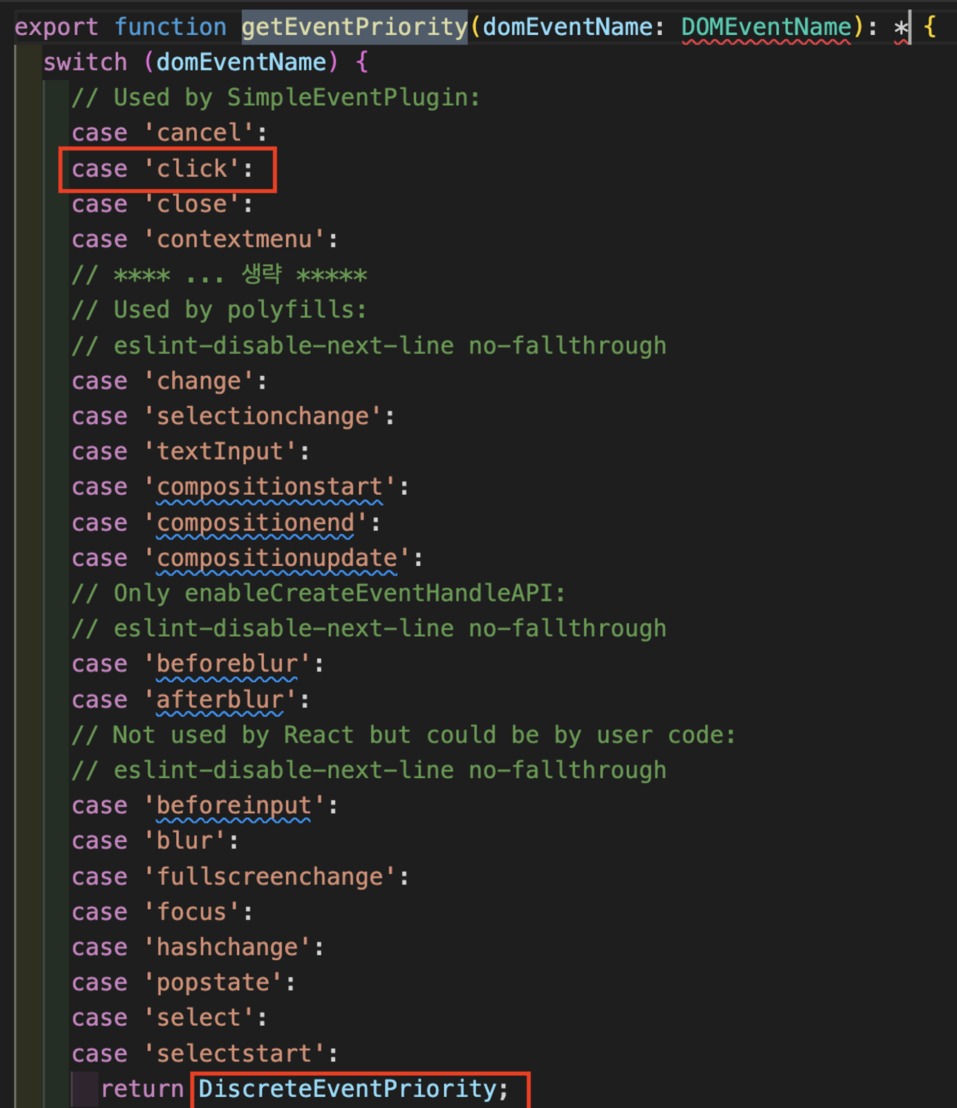 - topLevelEventsToReactNames 는 1편에서 react-dom.js 가 실행되자마자 사전에 매핑해두었던 Map 입니다. 이것을 이용합니다.