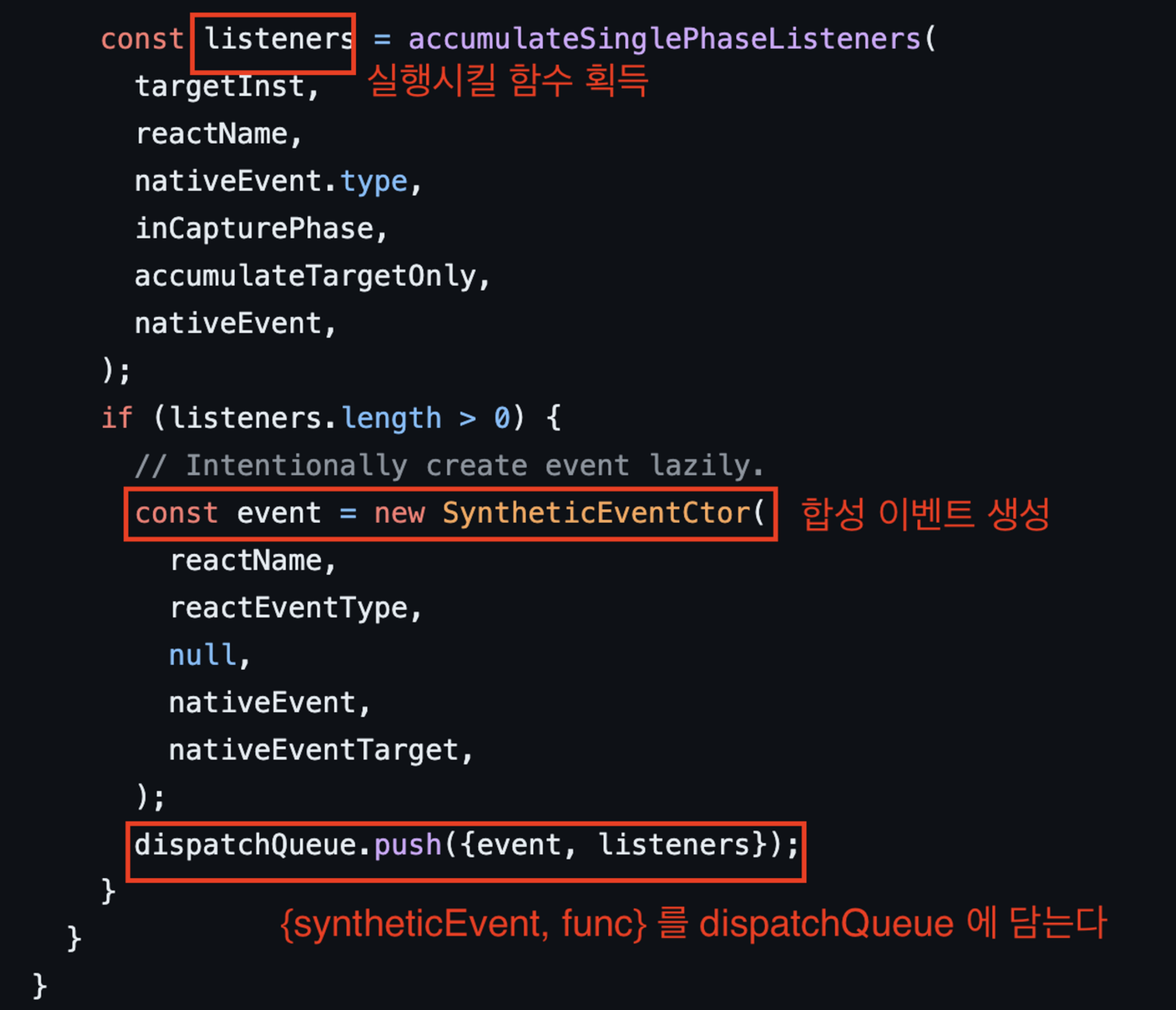 반환받은 listener는 바로 실행시키지 않습니다. dispatchQueue 라는곳에 담고, nativeEvent를 React 전용 Synthetic Event로 변환해주는 과정이 남아있습니다.