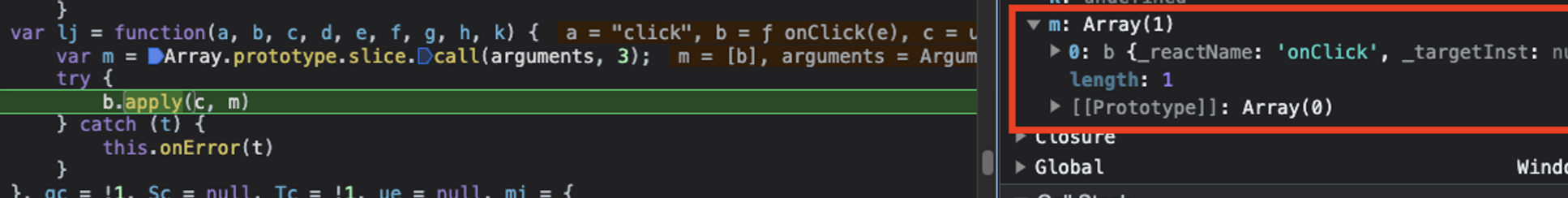 Production code에서 확인해보았습니다. funcArgs 에 해당하는 'm' 안에 nativeEvent가 아닌 SyntheticEvent 가 들어가있는것을 확인할 수 있었습니다.