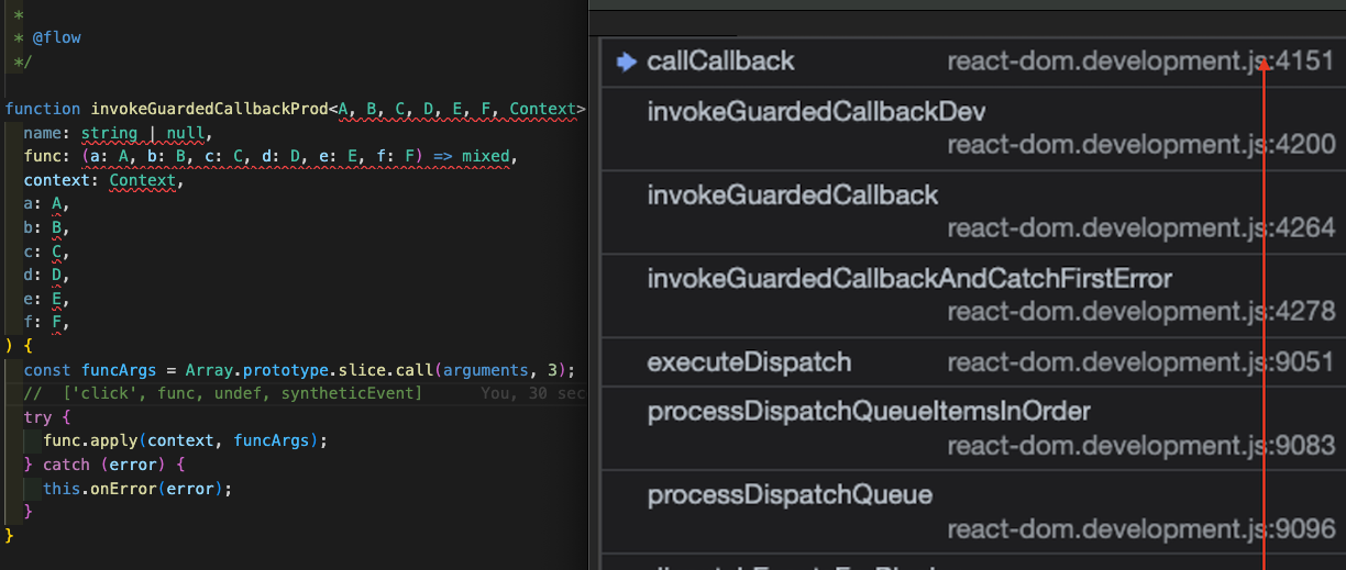 Call Stack에 있는 함수는 Dev 함수라서 이름은 다르지만, 결국 왼쪽처럼 func.apply(context, funcArgs) 를 통해서 함수를 실행시킵니다.