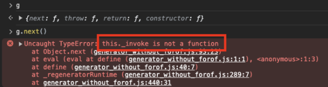 - _marked.next() 호출이 가능해지는 단계. 하지만 next 안에서 작동하는 함수 ('_invoke')가 등록되지 않아 에러 발생