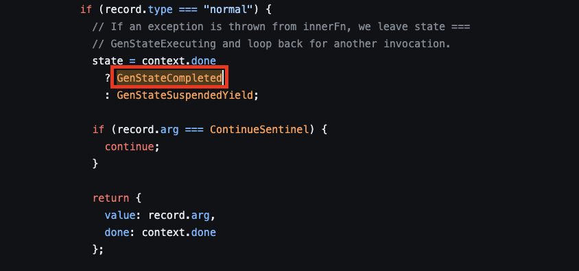 - wrap 함수에서 연결한 makeInvokeMethod가 switch-case 실행 이후 {value, done} 형태의 IteratorResult 반환