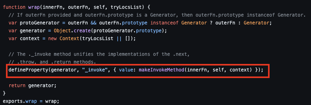 defineProperty(generator, "_invoke", { value: makeInvokeMethod(innerFn, self, context) });