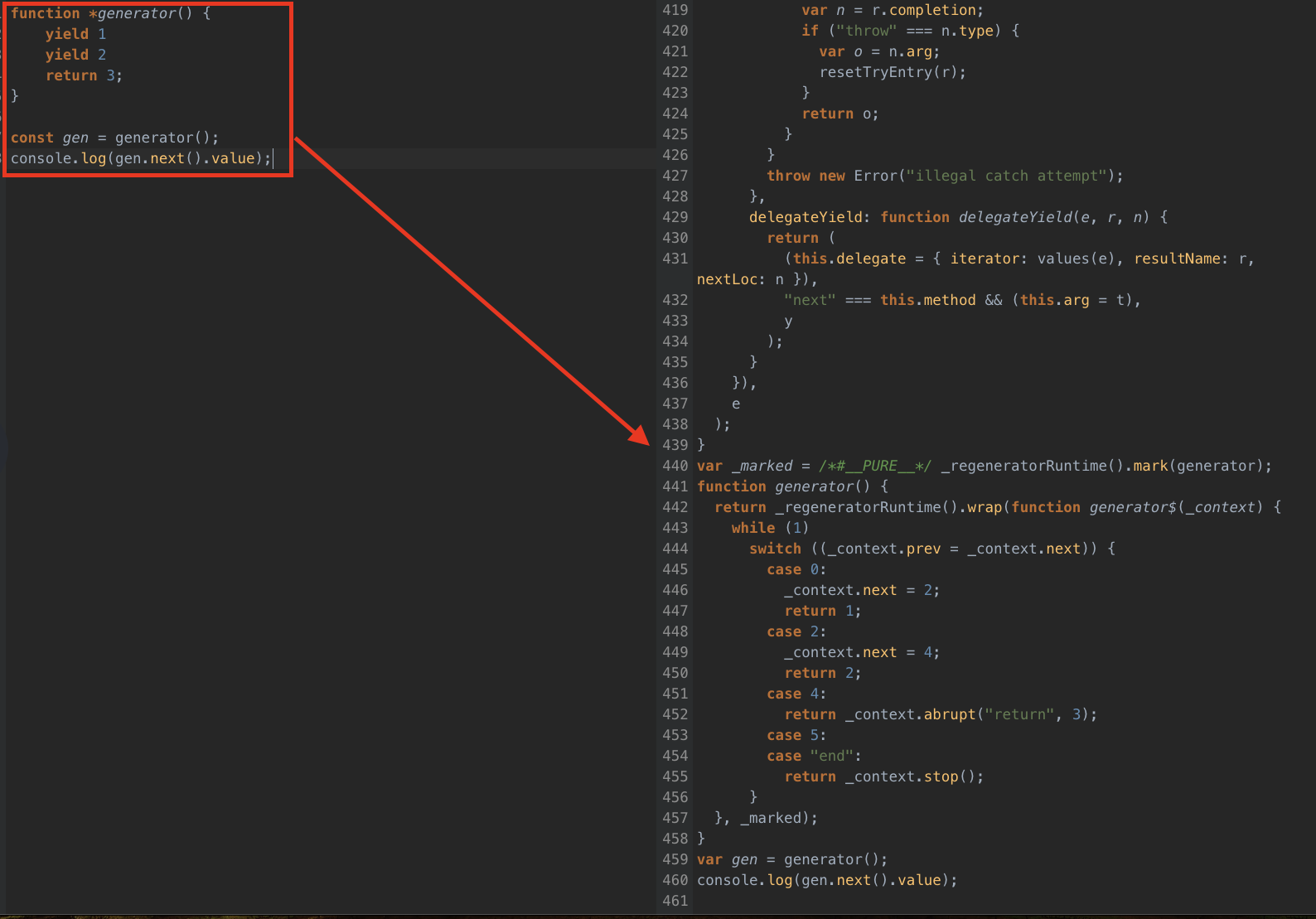 Babel에서 generator를 트랜스파일 하면 generator가 사용되지 않은 코드가 나옵니다.