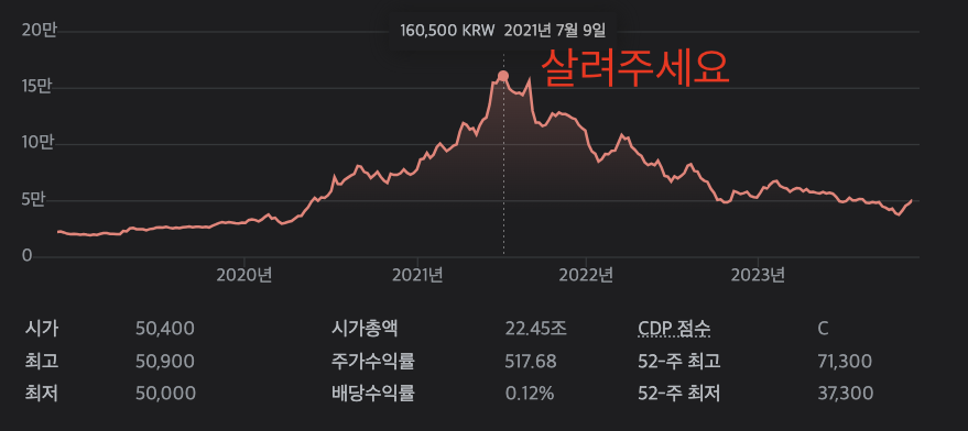 이때 학생이었는데 용돈으로.. 카카오에 다시 없을 역대 최고점에 풀매수를 했습니다.