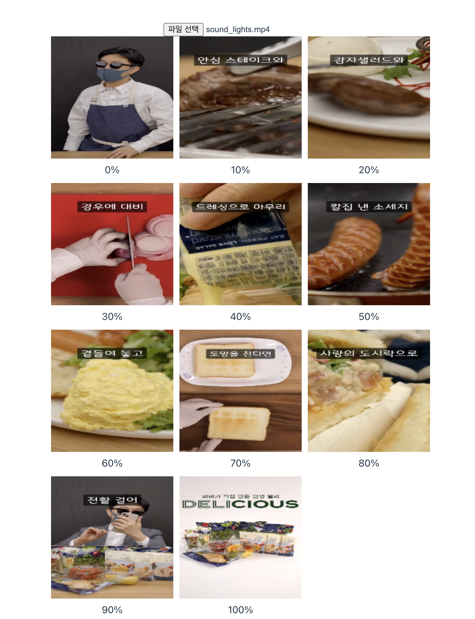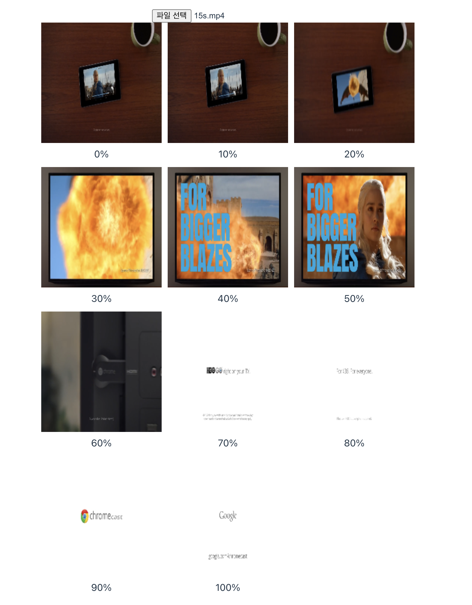 아래 예시 코드에 비디오 파일을 넣으면 다음과 같이 구간별로 썸네일이 추출되는 것을 볼 수 있습니다.