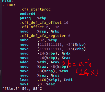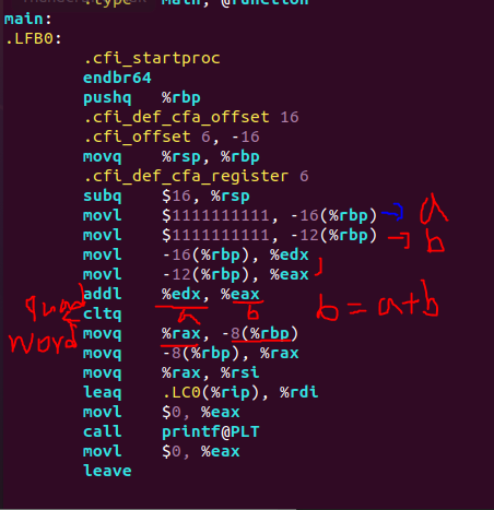 *참고 : movl 옆에 쓴 a와 b는 스택에 넣었따는 뜻이다. edx 와 eax가 실질적인 변수 레지스터가 된다.
