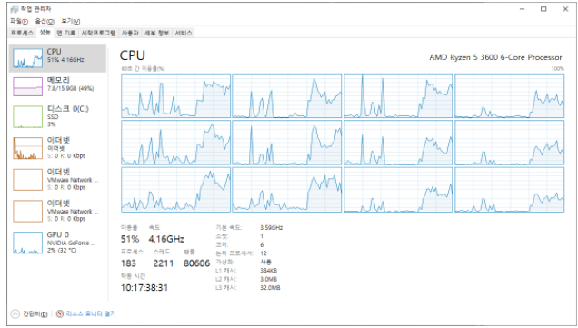 점유율이 난리가 났습니다. 근데 12쓰레드가 다 돌아가는걸 보니 기분이 좋네
