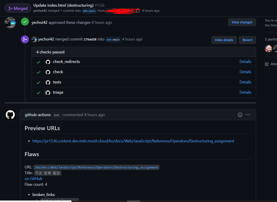 그래서 바로 신고를 했습니다. pr이 accept이 되고, merge가 되었습니다 짞짞짞!!!!