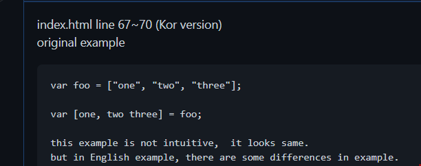 이전에 이렇게 되어있었습니다. 저는 처음에 이 예제를 보고, 변수를 []로 감쌀 수 있다는건 알겠는데, 굳이 변수명을 value와 같은걸로 해서 직관적이지 않게 해야하나? 생각했습니다. 영문을 보니 다르게 되어있었습니다!! 전 바로 깃허브에 신고를 했습니다