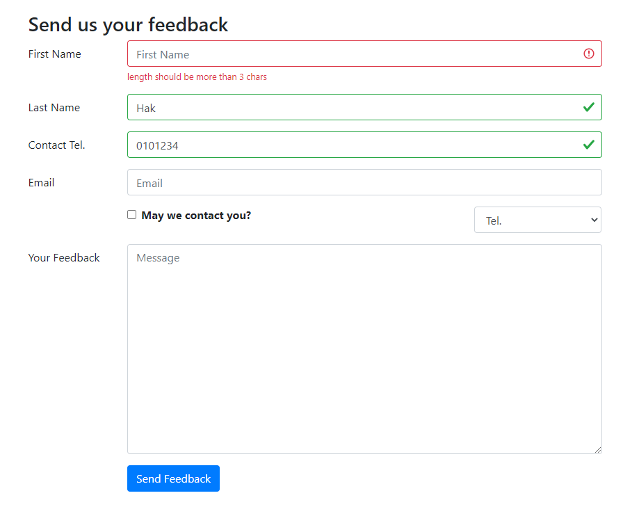 FormFeedback은 valid하지 않을때 그 아래부분에 빨갛게 나온 글씨를 말합니다. 이런식으로 valid가 아니면 FormFeedback이 나오게 할 수 있습니다.