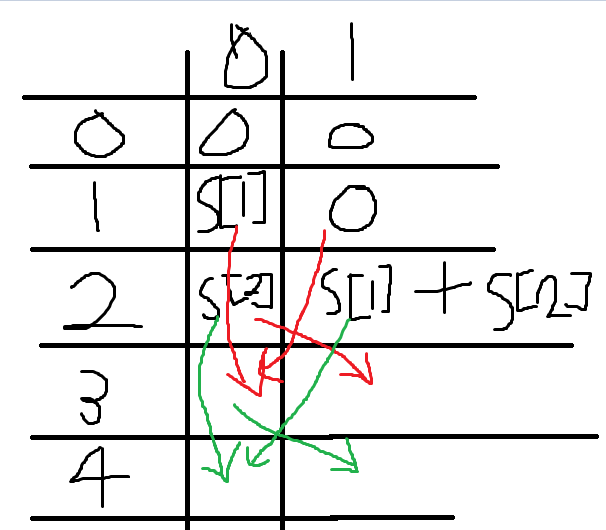 dp[n][0]은 불법(1칸->1칸)을 제외한 어떠한 방법이라도 써서 n번째 칸에 도착했을때 점수의 최대 합으로 생각했습니다. (바로 전에는 2칸 뛴거)