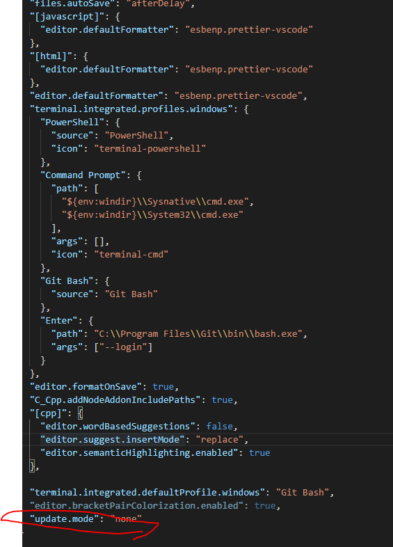 setting.json에 update.mode : "none"으로 해주세요.